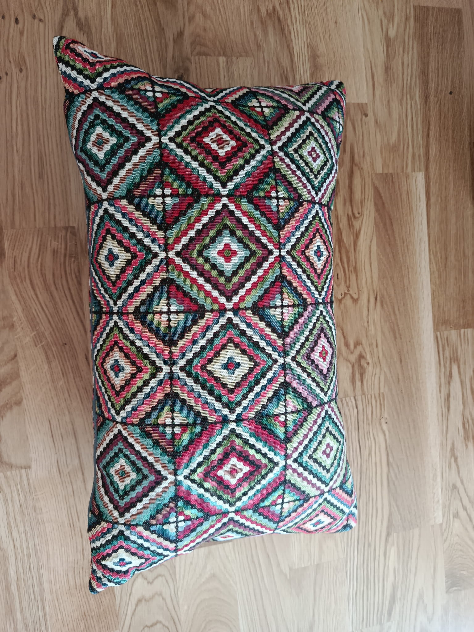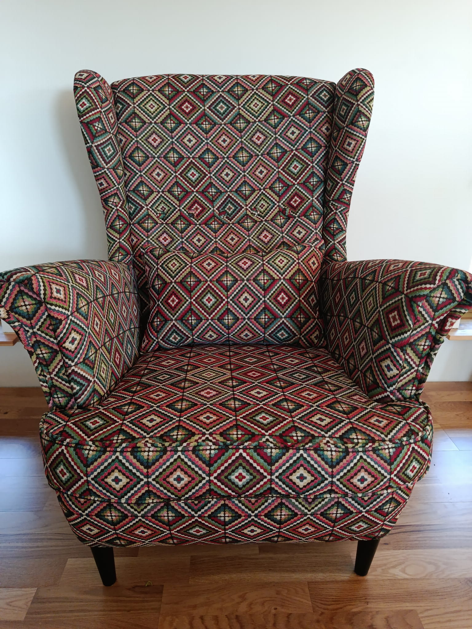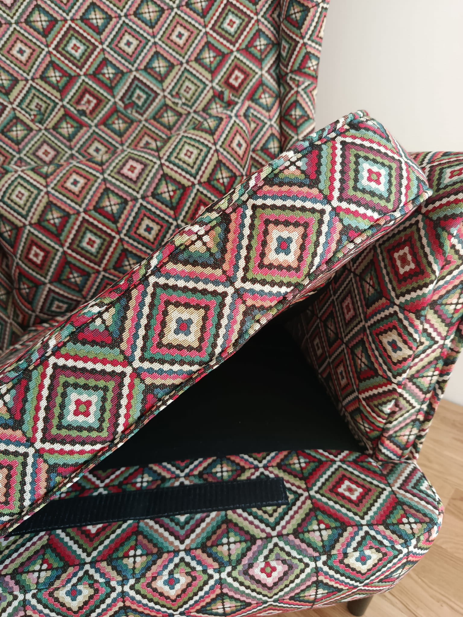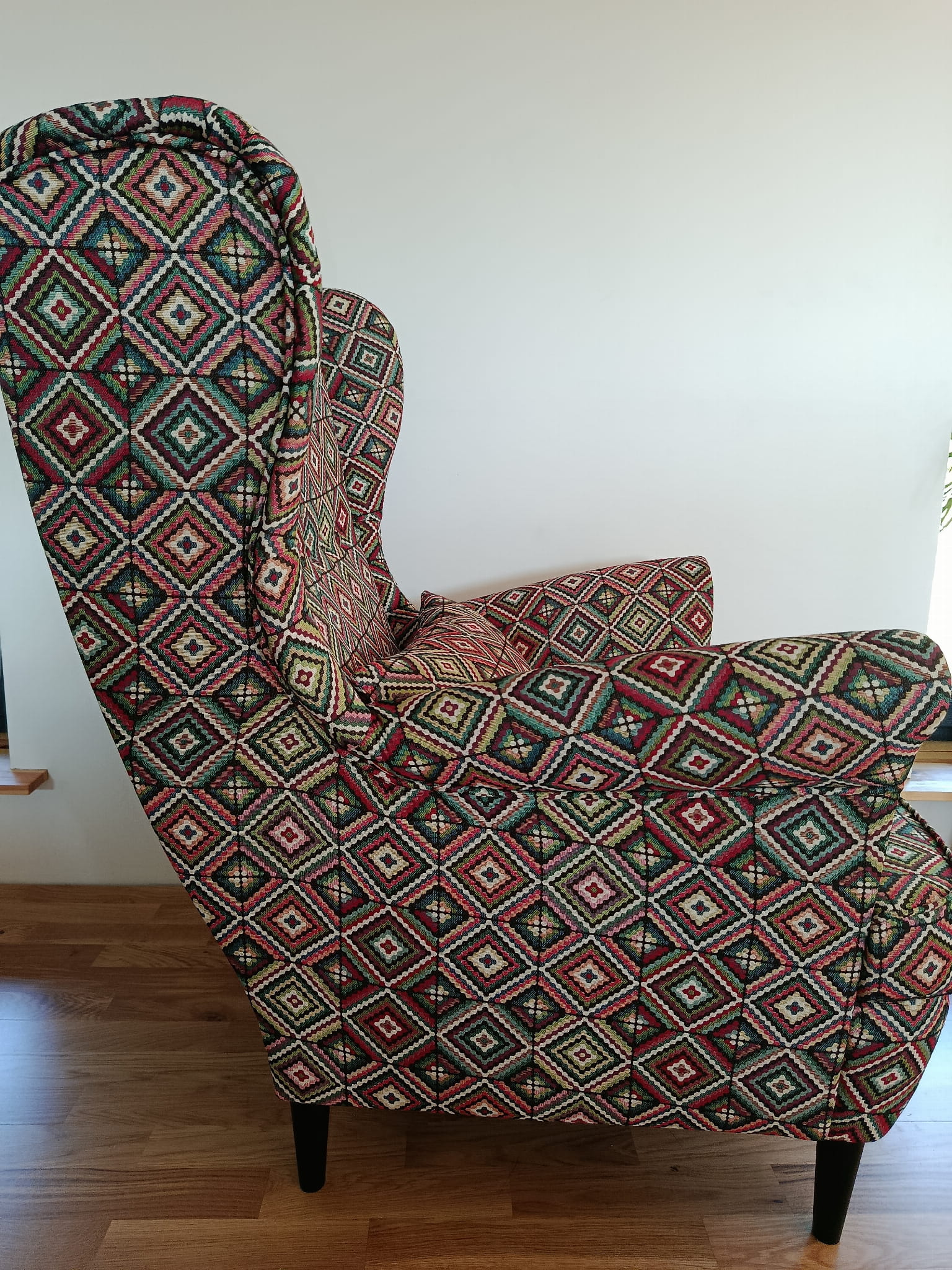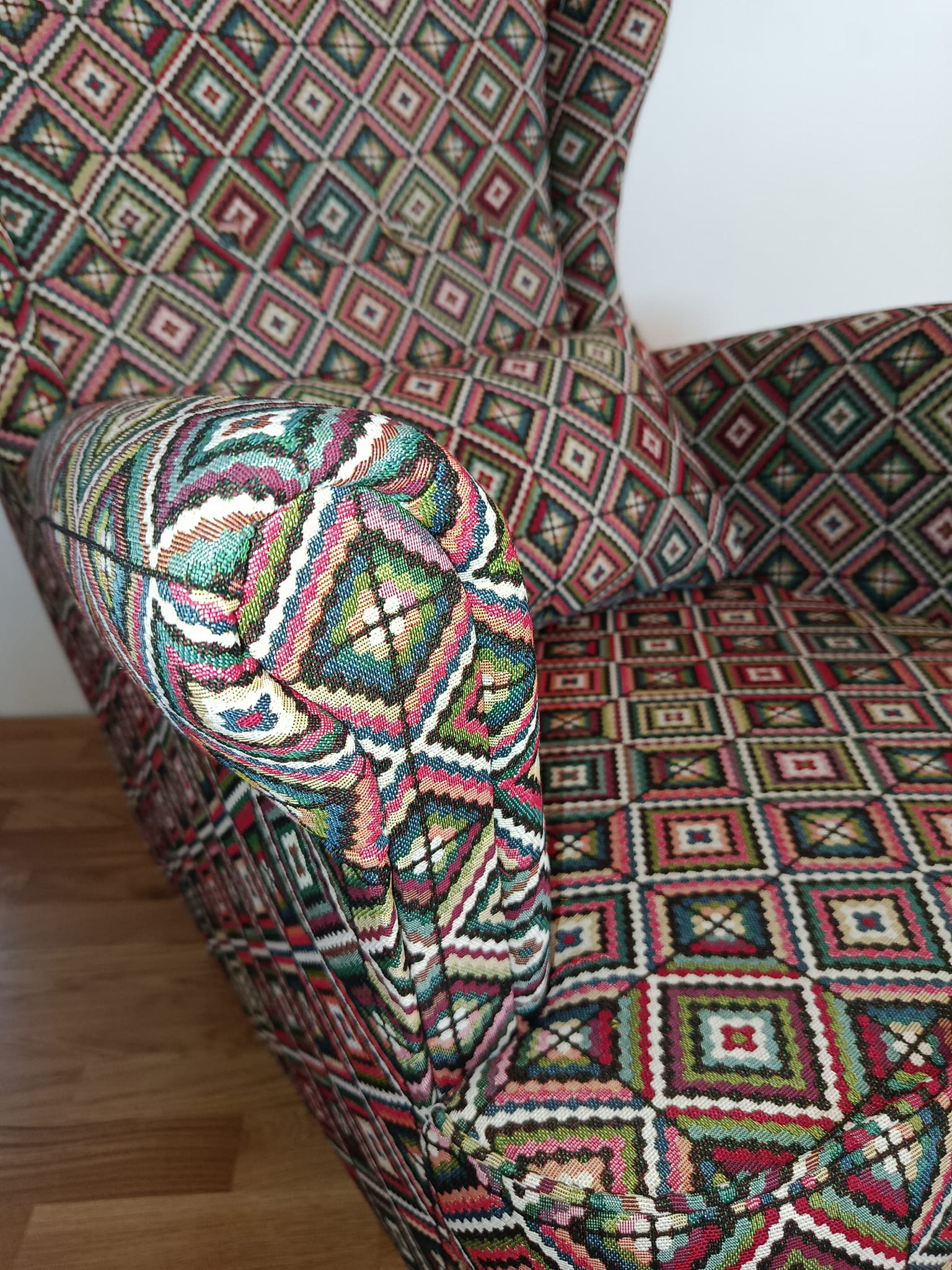 Fotel Uszak kolorowy +poduszka gratis romby multi wzór tkany +podnóżek