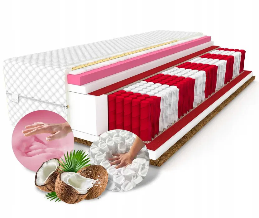 Dodatkowym atutem materaca jest zastosowanie pianki termoelastycznej typu VISCO, oraz maty z łupiny orzecha kokosowego.nPokrowiec dołączony do materaca posiada wszyty zamek 360° ułatwiający jego zdejmowanie.